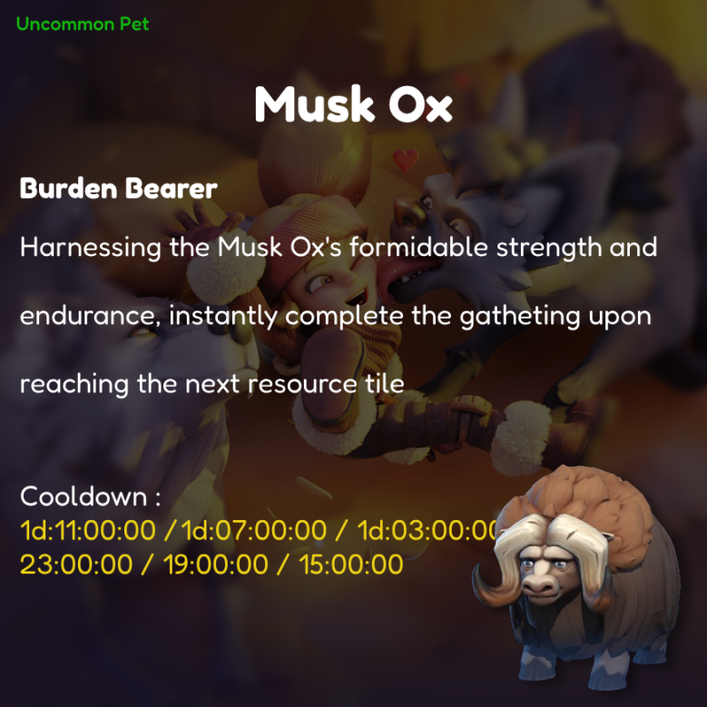 Skill Effect: Harnessing the Musk Ox's formidable strength and endurance, instantly complete the gathering upon reaching the next wilderness resources tile (excludes Secured Alliance Gathering Nodes).