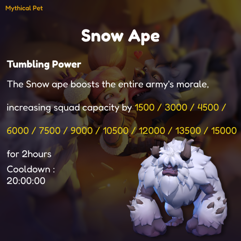 Skill Effect: The Snow Ape boosts the entire army's morale, increasing Squad Capacity by 1,500 / 3,000 / 4,500 / 6,000 / 7,500 / 9,000 / 10,500 / 12,000 / 13,500 /
