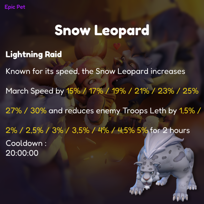 Skill Effect: Known for its speed, the Snow Leopard increases March speed by 15.00% / 17.00% / 19.00% / 21.00% / 23.00% / 25.00% / 27.00% / 30.00% and