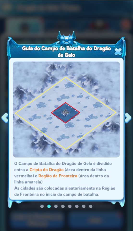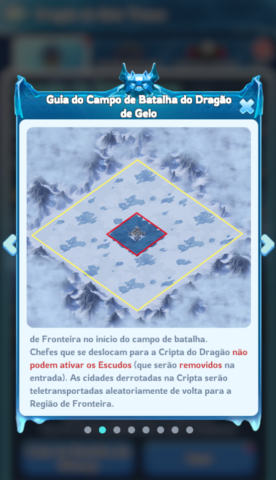 – O Campo de Batalha do Dragão de Gelo é dividido entre a Cripta do Dragão (área dentro da linha vermelha) e a Região da Fronteira (área dentro da linha amarela). As cidades são colocadas aleatoriamente na Região da Fronteira no início do campo de batalha. Chefes que se movem para a Cripta do Dragão não podem ativar Escudos (que são removidos ao entrar). Cidades derrotadas na Cripta serão teletransportadas aleatoriamente de volta para a Região da Fronteira.