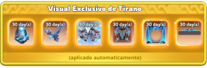 Bônus exclusivo do título Tirano (acumulável com outros bônus do título)Título exclusivo do Tirano: +10% de ataque, defesa, letalidade e saúde da tropa / +5.000 de capacidade de mobilização de tropas
