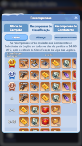 As recompensas de classificação da legião incluem visuais de marcha de 30 dias, construções de ilha, apostas de campeão, moedas de arsenal (forja), mithril, cristal de fogo e fragmentos de general herói mítico. Observe que os visuais de marcha e construções de ilha são apenas para as quatro melhores legiões e, além disso, a marcha da legião em primeiro lugar difere da marcha do segundo, terceiro e quarto lugares, e a legião em primeiro lugar ganha uma construção de ilha adicional.