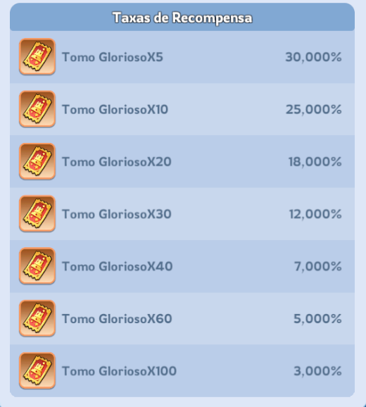● O token de evento Tomo Glorioso é válido permanentemente e não será removido após o término do evento. Ele pode ser guardado para uso no próximo evento. A probabilidade de obter Tomos Gloriosos no baú é a seguinte:
