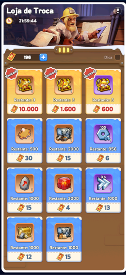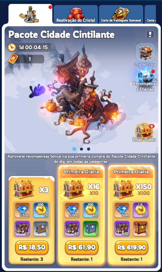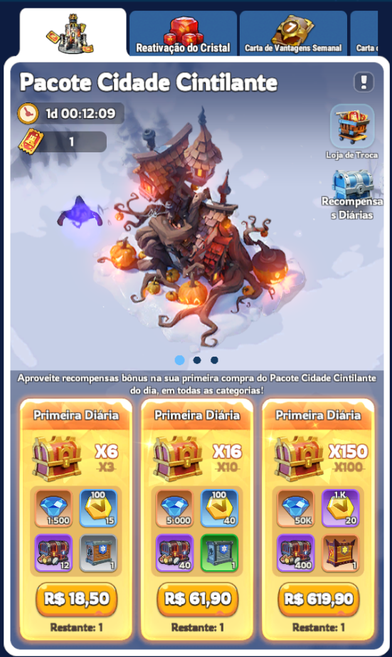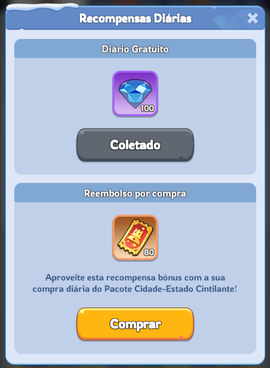 ● Disponível para resgatar 100 gemas grátis todos os dias e 80 Tomos Gloriosos como recompensa bônus na compra do seu Pacote Cidade Brilhante diário.