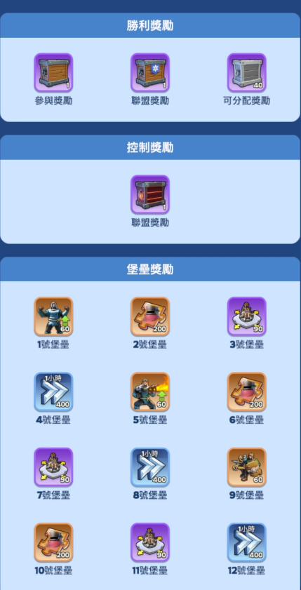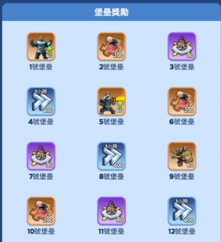 每個堡壘有各自不同的獎勵,將會隨著遊戲時程變化