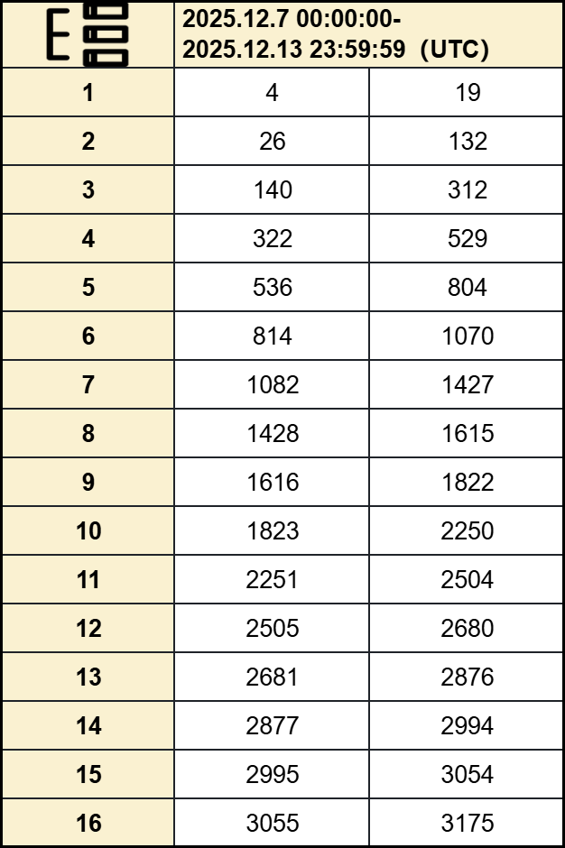 2025年12月7日00:00:00-2025年12月13日23:59:59(UTC+0)